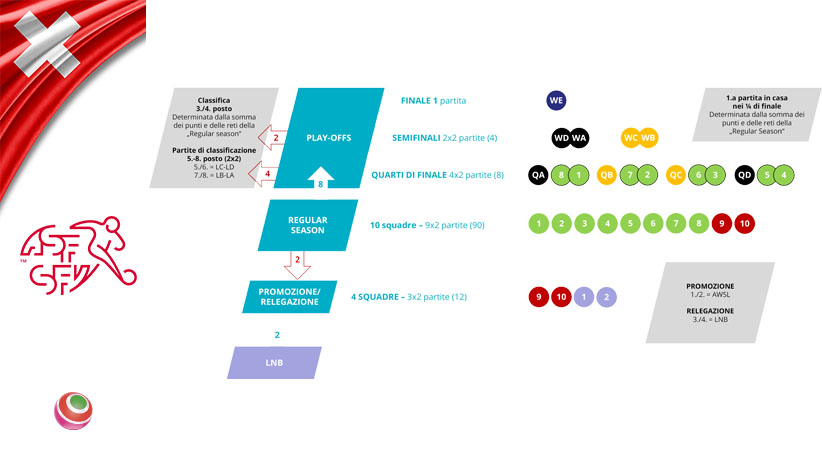 Dalla stagione 2021/21 l’AXA Women’s Super League sarà disputata in un formato più attrattivo ed innovativo. Alla conclusione della regular season formata da 18 giornate con gare di andata e ritorno, le prime 8 squadre classificate si contenderanno il titolo di campione svizzero nella fase playoff ad eliminazione diretta con modalità coppe europee. Inoltre, il numero totale delle squadra sarà di 10, ben 2 in più rispetto alla passata stagione.