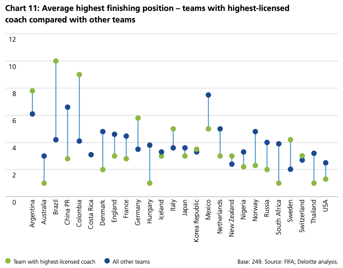 Ben il 93% degli allenatori ha una licenza da allenatore nelle massime leghe del calcio femminile del mondo, dove inoltre il 64% delle leghe richiede che l’allenatore della prima squadra della top serie abbia una licenza Pro o A.