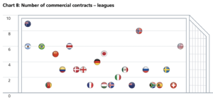 Due terzi delle leghe ha un title sponsor (titolo di lega), tra cui emergono principalmente sponsor legati a servizi finanziari, energia, telecomunicazioni, cibi e bevande. Le revenue per una lega con il title sponsor guadagnano di più di quelle senza ($2.2m vs $1.8m). Esempi di title sponsor si trovano nell’AXA Women’s Super League (Svizzera), in Germania con la FLYERALARM Frauen-Bundesliga, LaLiga Iberdrola (Spagna),…