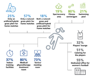 La maggior parte delle squadre di calcio femminile nel mondo ha un regolare accesso alle strutture di allenamento per giocare a calcio, tra cui l’80% dei club ha a disposizione anche palestre e stanze mediche. Invece solo il 21% ha a disposizione piscine e il 19% a zone spa/recupero muscolare.