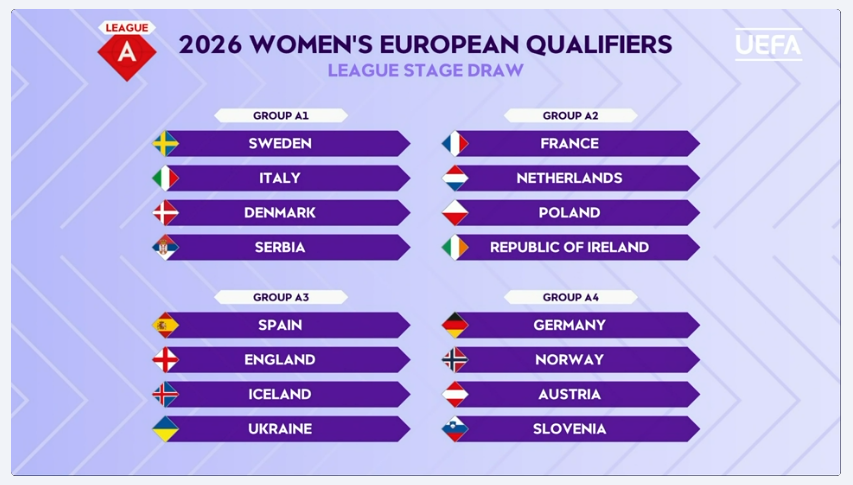 Qualificazioni europee femminili per la Coppa del Mondo femminile FIFA 2027: l‘Italia viene inserita nel girone A1 contro Svezia, Danimarca e Serbia.
