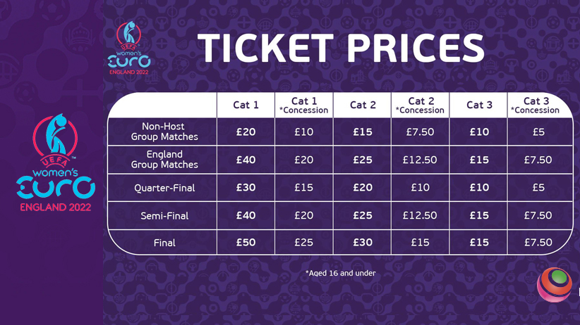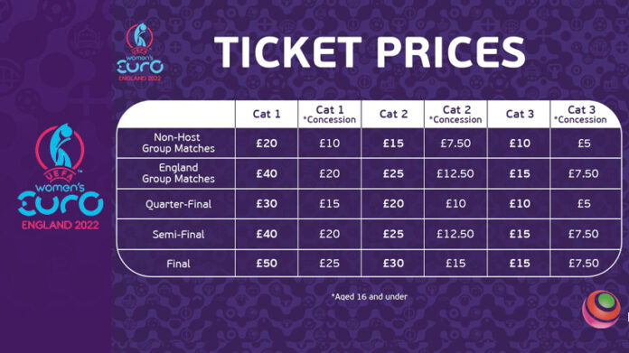 Sono stati annunciati i prezzi dei biglietti per UEFA Women’s EURO 2022 in Inghilterra. Oltre 700.000 biglietti verranno messi in vendita a metà febbraio per la fase finale che si giocherà dal 6 al 31 luglio del prossimo anno.