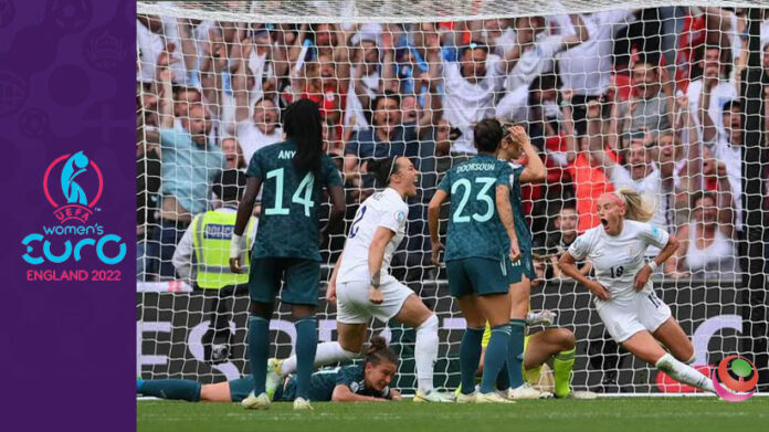Proprio Toone va in gol dopo soli 7′. Con l’Inghilterra temporaneamente in 10 per l’uscita dell’infortunata Mead, Keira Walsh serve un passaggio filtrante dalle retrovie per Toone, che punta la porta, si trova davanti a Frohms e insacca con freddezza. La Germania risponde e colpisce una traversa con Magull; sul rimpallo, Schüller spedisce tra le braccia di Earps, che tira un sospiro di sollievo.