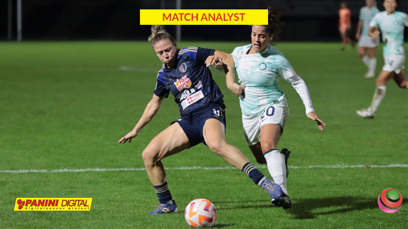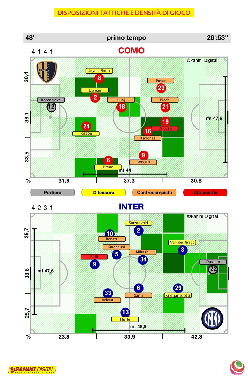 Il grafico della disposizione tattica a firma Panini Digital ci mostra, per l’Inter, un baricentro ed una linea di pressing più bassi a fronte di un maggior utilizzo delle corsie laterali in ambo le frazioni di gioco, non necessariamente in fase di attacco, ma soprattutto in difesa ed in fase di costruzione sull’asse Kristjansdottir – Merlo o Sonstevold – Bonetti, considerando anche una maggiore spinta delle padrone di casa nella ripresa, quando, a giochi fatti, all’Inter bastava gestire risultato e rischi.