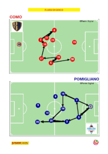 Analizzando i flussi di gioco, possiamo affermare che il Como ha cercato affondi laterali, riuscendo a spingere e a costruire la manovra offensiva soprattutto sul lato sinistro del campo. Allo stesso modo si è comportato il Pomigliano che nel passaggio da una fascia all’altra del terreno di gioco si è appoggiato centralmente sulla regia di Ferrario, prima per palloni recuperati, ben 27, e seconda per 60 palloni giocati dietro a Fusini con 68 che è anche prima per passaggi riusciti e giocate utili. Nel Como, negli stessi parametri di Fusini, nota di merito va alla numero 2 con fascia da capitano al braccio Lipman, fulcro della costruzione comasca con 48 passaggi riusciti, mentre la più attiva in fase conclusiva è Karlenas con 3 tiri verso la porta avversaria.