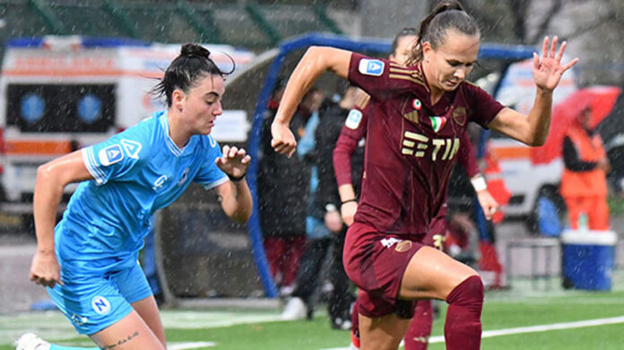 La prima vera occasione da gol del match arriva al 17′ per la Roma con il calcio di punizione di Giugliano che dai 23 metri circa finisce di poco a lato. Prima occasione per il Napoli al 20′ con l’imbucata di Kullashi per Novellino che può servire al centro Moretti ma l’arbitro fischia la posizione di fuorigioco. Al 22′ ancora Roma in avanti con Troelsgaard che raccoglie un pallone perso da Pettenuzzo in impostazione e la danese fa partire il destro da fuori che si stampa sulla traversa. Altro legno per la Roma al 26′ con Giacinti che da sinistra calcia a giro col destro e il pallone sfiora la traversa e si spegne sul fondo. Al 29′ altra chance da rete per le giallorosse con Kuhl che da fuori scaglia il destro di potenza ma Beretta riesce a bloccare. Al 35′ si affaccia il Napoli nell’area avversaria con Moretti che dalla sinistra salta Thogersen e crossa in mezzo dove però nessuno legge il passaggio e Ceasar esce e blocca. Si fa vedere ancora Kuhl che dal limite dell’area raccoglie il passaggio orizzontale di Thogersen e calcia di prima intenzione ma la palla termina alta. Si chiude in parità la prima frazione.