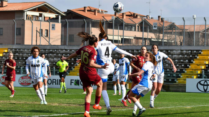 Ottimo inizio delle giallo rosse con Dragoni regista sinistra, palla sui piedi di Giugliano che calcia veros la porta, sulla traiettoria arriva Viens che, da due passi, appoggia in rete. Un match iniziato con il piglio giusto per le ospiti che poco dopo potrebbero raddoppiare grazie ad un retro passaggio errato del Sassuolo. Padrone di casa che con Chmielinski provano ad attaccare i pali di Kresche, ma Linari è attenta e in scivolata riesce ad anticipare l’attaccante. Al 26′ dopo un pressing estenuante arriva il raddoppio: Haavi mette il cross dalla sinistra e sul secondo palo trova Corelli che di testa supera Lonni. Si chiude un primo tempo con 273 passaggi per le ospiti, contro i 171 delle locali, per una gara che al momento parla chiaro: la Roma molto più dinamica e caparbia vuole vincere questa sfida.