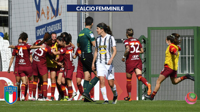 La Roma si aggiudica 2-1 la semifinale d’andata della Coppa Italia TIMVISION con la Juventus e festeggia il primo successo ai danni delle bianconere in tutte le competizioni. Al ‘Tre Fontane’ partono aggressive le padrone di casa, che dopo appena due minuti sbloccano il punteggio: spunto in velocità sulla destra di Thomas, Lazaro raccoglie il pallone e lo gira per Andressa che vede e serve Serturini dalla parte opposta; destro sul secondo palo e vantaggio giallorosso. Le ospiti provano a reagire al quarto d’ora con Pedersen, ma il sinistro della danese dopo aver attraversato tutta l’area di rigore avversaria si deposita a lato della porta. Le undici di Rita Guarino non trovano spazi e il giropalla è troppo lento per impensierire una Roma attenta, che chiude la prima frazione di gara sull’1-0. A inizio ripresa però l’ingresso in campo di Bonansea per Alves si rivela decisivo: l’attaccante al 49’ si lancia sulla corsia di destra, salta Soffia e mette in mezzo un cross perfetto per Hurtig, che si trascina il pallone in porta e firma il pari. Dopo appena 10’ però l’autrice dell’assist bianconero è costretta ad abbandonare il campo per un fastidio muscolare e a lasciare il posto a Zamanian. Nel corso della ripresa out anche Andressa, disturbata dal colpo alla caviglia subito nel primo tempo, e Girelli, che al 71’ esce in barella in seguito ad uno scontro aereo con la compagna di Nazionale Linari. Le padrone di casa cercano di approfittare del doppio infortunio delle rivali e alzano il pressing. Al 74’ solo un miracolo della difesa juventina nega loro il 2-1: bel cross di Bernauer dalla destra, Giuliani interviene male e il pallone finisce sul destro di Serturini che inquadra la porta ma trova l’opposizione di Sembrant sulla linea. Le giallorosse però continuano ad essere più pericolose e all’88’ vengono premiate: protagonista ancora Bernauer, che con un lancio perfetto scavalca Lundorf e trova Serturini dalla parte opposta: Giuliani dice no al primo tentativo della giallorossa, ma non può evitare la ribattuta di Thomas, che arriva in velocità alle spalle di Boattin e sigla un gol vittoria pesante. La Vecchia Signora invece dopo quasi due anni incassa una sconfitta contro un club italiano, dopo quella del marzo 2019 con il Sassuolo.