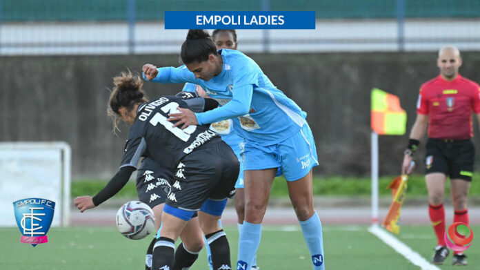 Ulderici schiera le stesse undici del derby con la Fiorentina, fatta eccezione di Ciccioli per Capelletti. Al nono retropassaggio di Corrado ad Aguirre con il portiere campano che prende la palla con le mani, con l’azione interrotta con Nocchi in procinto di battere a rete. Sulla successiva punizione indiretta di Prugna, si genera una mischia con Nocchi che calcia fuori da pochi passi. Al 20’ si affaccia in avanti il Napoli con un destro dalla distanza di Sara Tui, alto sopra la traversa. Poco dopo combinazione Jaimes-Popadinova con conclusione di quest’ultima che si perde sul fondo. Preme il Napoli: al 21’ sulla conclusione di Sara Tui si allunga Ciccioli spingendo la palla in angolo. Ancora brava Ciccioli stavolta su Popadinova. Reazione delle azzurre che sfiorano il vantaggio sugli sviluppi di un calcio di punizione di Prugna, si crea una mischia, ma manca la stoccata vincente. Al 28’ fuori Abrahamsson per infortunio, a seguito di un duello aereo con Dompig, e dentro Acuti. Al 35’ sblocca il risultato in Napoli con Acuti che giudicata in posizione regolare supera Ciccioli in diagonale. L’Empoli reagisce. Prima Prugna offre a Dompig la palla del possibile vantaggio ma la sua conclusione è troppo centrale. Al minuto 40 è Norma Cinotti a pareggiare il conto, approfittando di una indecisione della difesa del Napoli. Sul finire di frazione, causa infortunio, Aguirre deve abbandonare il campo per far spazio a Chiavaro. Primo tempo che termina 1-1.