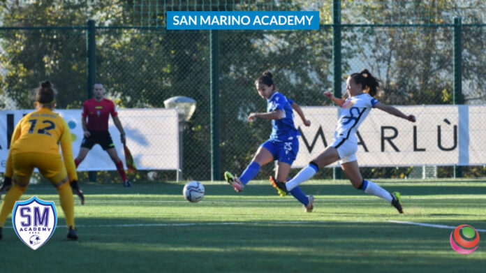 Il primo tiro in porta dell’Inter si registra al 20’, con un calcio di punizione affidato a Regazzoli. Piazza si oppone e sulla mischia generata la terza linea sammarinese fa schermo sulle conclusioni avversarie: l’ultima di Polli, che di testa spedisce a lato. Nell’altra metà campo, grandissima occasione per l’Academy: Alborghetti sfonda in area e viene toccata da Simonetti, in maniera fallosa secondo Grieco che comanda il calcio di rigore. Dal dischetto Baldini, che apre il piattone e spedisce alto sulla traversa. Si resta sullo 0-0, con l’Inter che prova a far pagare dazio immediatamente con Portales – brava a girarsi in un fazzoletto e sollecitare Piazza da posizione defilata. Risposta efficace dell’estremo di casa, che chiude in angolo.
