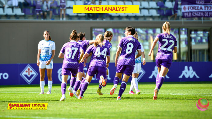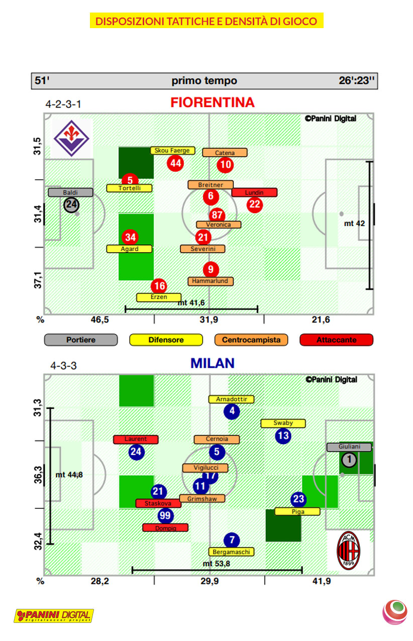 La Fiorentina con il suo 4-2-3-1 si posiziona sul campo con un enorme potenziale di centro campo: Catena, Breitner, Veronica, Severini e Hammarlund creano un vero muro a verticalizzazioni delle avversarie; l’unica punta Lundin stando a 21 mt dalla porta difesa da Laura Giuliani può andare al tiro appena presa palla. Le padrone di casa restano in 10 nei 41.6 metri di tutto il primo tempo, concedendo ben pochi spazi alle avversarie; che dal loro lato con il 4-3-3 si aprono molto nella centrale con Cernoia, Vigilucci e Grimshaw lasciando le fascia: con Bergamaschi e Arnadottir sempre marcate a vista. In fase difensivo Piga e Swaby restano sole, proprio nel momento finale di gioco che innesca la rete avversaria.