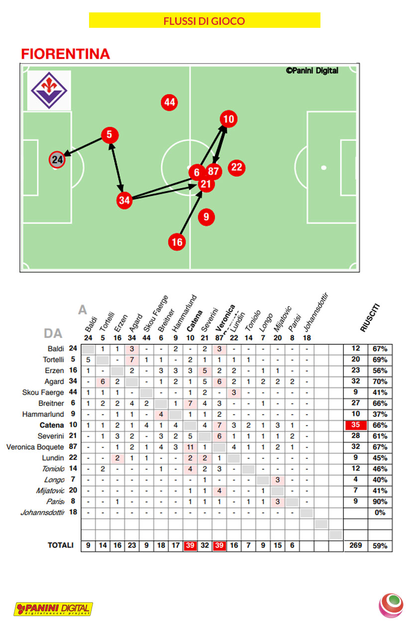 Oltre a Catena la fiorentina posiziona Verinica Boquete in testa alla giocate utili, con ben 18 (seguita da Michela con 13 ed Agard con 10) anche i tiri a rete di Longo e Lundin hanno contributo a tenere alto il gioco ed a rendersi decisamente pericolose.