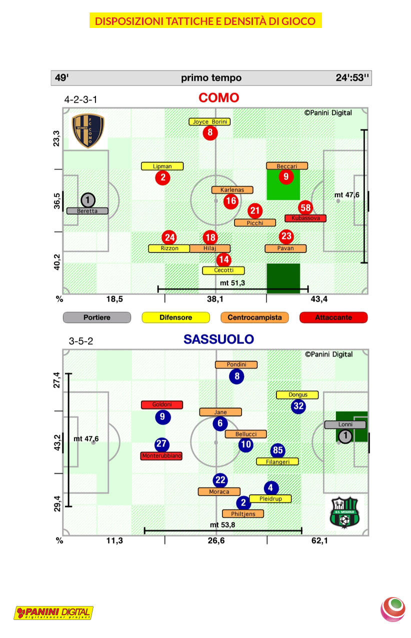 Il quadro che emerge dal grafico relativo alla densità di gioco a firma Panini Digital ci delinea un Como padrone del centrocampo, con un baricentro medio decisamente più alto rispetto alle avversarie ed attestatosi sui 62 metri, e che ha gestito il possesso della sfera nella metà campo avversaria per 9 minuti, più del doppio rispetto a quanto fatto registrare dalla formazione di Mister Piovani capace, quest’ultima, di giocare 492 palloni, il 55% dei quali in maniera positiva, ma in zone troppo distanti dalla porta avversaria: i passaggi bassi utili nella metà campo avversaria sono 48 in meno rispetto alla formazione di casa. In attacco la formazione di De La Fuente è stata decisamente più pericolosa con 6 occasioni create, una in più delle avversarie, ma ben 19 tiri verso i pali protetti da Lonni, protagonista di 5 uscite e 3 parate, una in più della collega avversaria Beretta che ha causato, ma poi neutralizzato, un calcio di rigore. 9 conclusioni a marchio lombardo sono finite fuori dallo specchio, 7 sono state effettuate da Kubassova e 10 sono arrivate da fuori area. Le finalizzazioni della squadra ospite, pervenute per metà su azione e le altre 3 da calci piazzati, sono soltanto 6 in 100 minuti reali di gioco, ma risultano, in percentuale, molto più precise: 4 di esse, a testimonianza di ciò, hanno mirato e centrato lo specchio della porta.