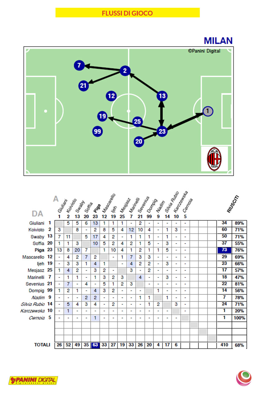 Vediamo il flusso di gioco di Como e Milan. Partiamo dal Diavolo Rosso che hanno giocato 626 volte il pallone (60%), mentre ha effettuato 410 passaggi riusciti (67%): a farne di più sono state Julie Piga che ha servito 73 palloni, ma allo stesso tempo ha visto riceverne 53.