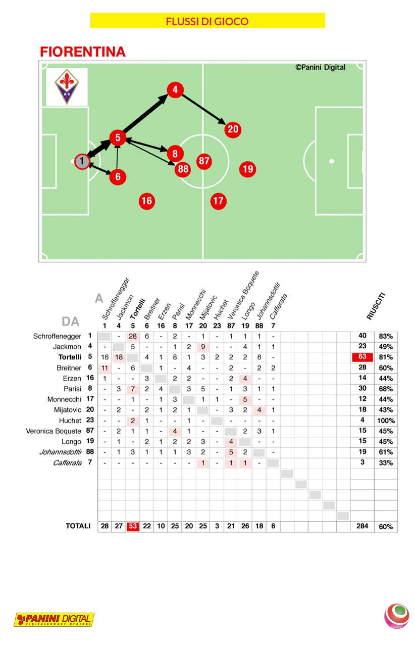Il grafico sulla disposizione tattica ci mostra come la formazione toscana abbia giocato il maggior numero di palloni nelle zone centrali del campo, in particolare nel primo tempo, mentre le nerazzurre hanno espresso la costruzione della propria manovra offensiva sfruttando le corsie laterali del terreno di gioco: è quanto dimostrato anche dai flussi di gioco che vedono, per parte viola, fraseggi centrali con sforamenti a sinistra, mentre per l’Inter vere e proprie costruzioni su ambo le fasce. Nel secondo tempo il maggior numero di palle giocate dalla Fiorentina è arrivato dalle retrovie, infatti la numero 1 Schroffenegger risulta seconda, dietro a Tortelli, per quantità di palloni giocati e passaggi riusciti. Tra le nerazzurre si sono espresse con costanza, nei 90 minuti, Polli che ha realizzato 8 tiri verso la porta, Karchouni con 4 tentativi di assist e Mihashi, la più attiva a centrocampo in ricezione della palla, in impostazione e in interdizione con 85 palloni giocati e 31 recuperati.