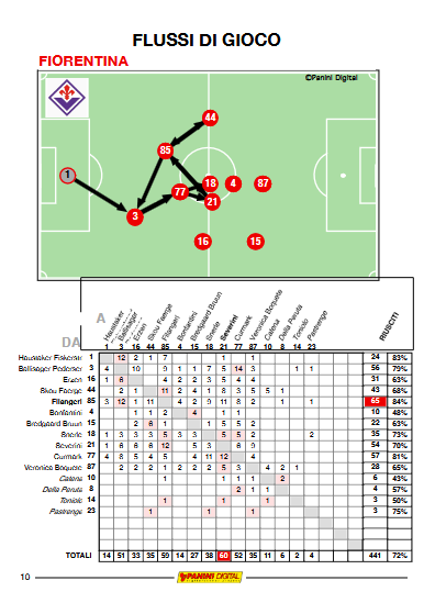 Entrambe le compagini hanno provato a giocare partendo dal basso e, infatti, la percentuale di azioni manovrate in questo modo è pari al 95,9% per la Fiorentina e al 92,7% per il Milan.