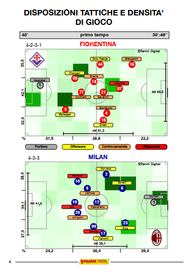 Anche le altre statistiche ci sottolineano l’equilibrio avuto all’interno dei 90 minuti: possesso palla (51% vs 49%, superiore per le meneghine nel primo tempo e viceversa nel secondo), baricentro (53,5 mt vs 55,1 mt), supremazia territoriale (50% vs 50%, anche in questo caso superiore nella prima frazione per le rossonere e per le gigliate nella seconda) e pressing (46,4 mt vs 47,9 mt). L’unico dato in cui il Diavolo supera la Viola sono le palle giocate in area di rigore: 42 a 62; statistica relativa dato che il numero delle occasioni da gol sono favorevoli alle padrone di casa (3 vs 2).