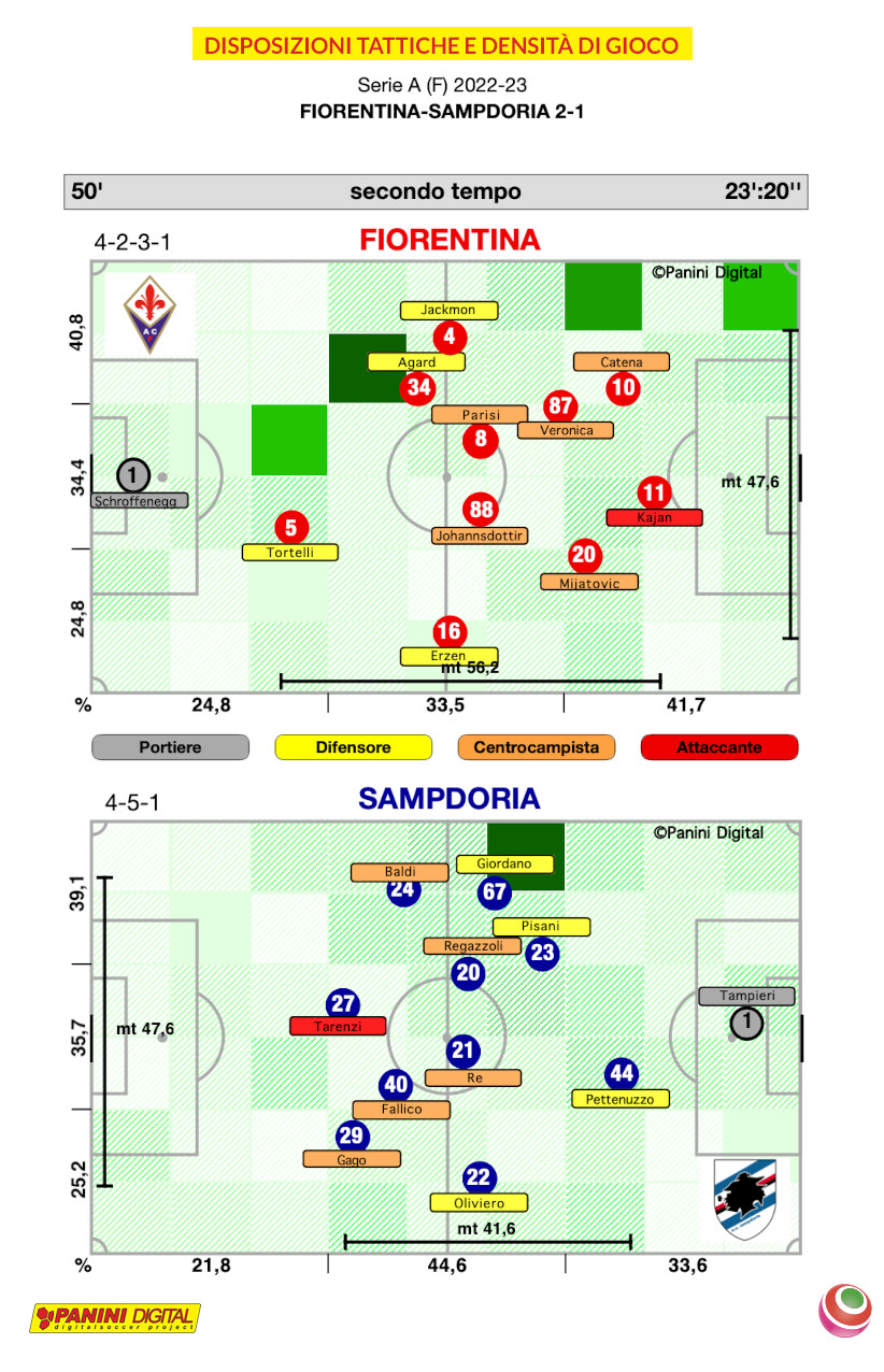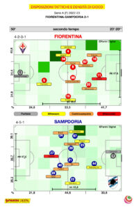 I due minuti di “follia” che hanno condannato la Samp alla sconfitta non sono però stati frutto della fortuna, bensì di un atteggiamento decisamente più propositivo e offensivo nel corso del secondo tempo. A differenza dei primi 45 minuti, infatti, il baricentro delle fiorentine è avanzato di ben 11,7 metri, portando il rapporto tra le due percentuali di supremazia territoriale da un iniziale 53% a 47% a favore delle blucerchiate ad un 58% a 42% per la Viola. Ciò ha infatti portato a ben 16 palle giocate dalla Fiorentina in più nell’area avversaria rispetto al primo tempo, con il successivo crollo della percentuale di difesa di questa zona da parte della Samp dal 50% al 34% e una maggiore esposizione della propria porta ai tiri dentro delle toscane (5 sui 12 tiri effettuati nel secondo tempo).