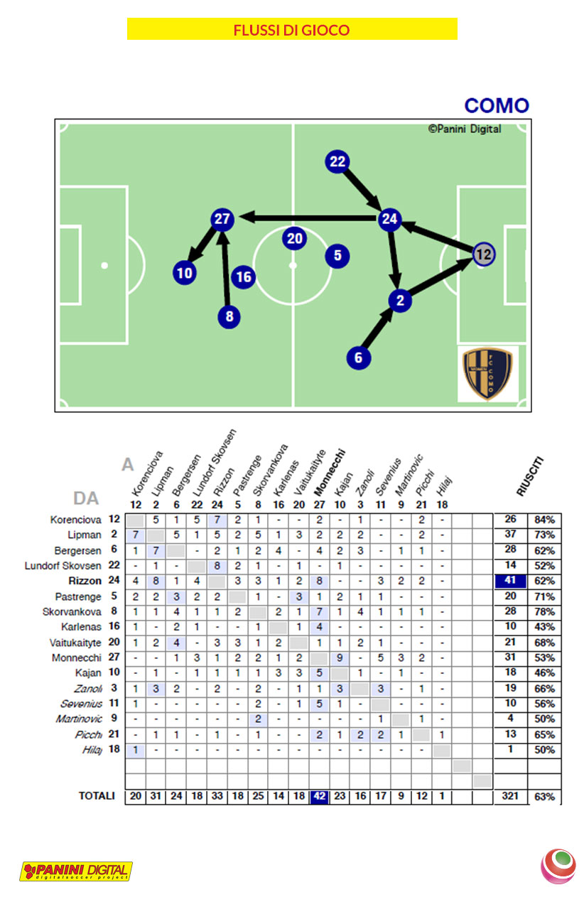 Vediamo il flusso di gioco di Pomigliano e Como. Partiamo dalle comasche che hanno giocato 530 volte il pallone (55%), mentre ha effettuato 321 passaggi riusciti (58%): a farne di più è stata Giulia Rizzon che ha servito 104 palloni, e 8 li ha consegnati a Margherita Monnecchi che si è vista consegnare ben 42 sfere nell’arco di tutto l’incontro.