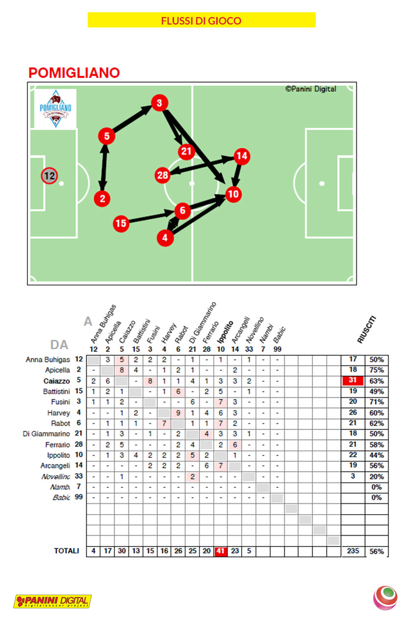 Per quanto riguarda la squadra pomiglianese, essa ha usato la sfera 432 volte (45%), e se l’è passata 235 volte (42%): è Sara Caiazzo quella che ha spostato più volte il pallone con 31 passaggi, di cui 8 sono stati dati a Martina Fusini, mentre Dalila Ippolito ne ha ricevuti 41.