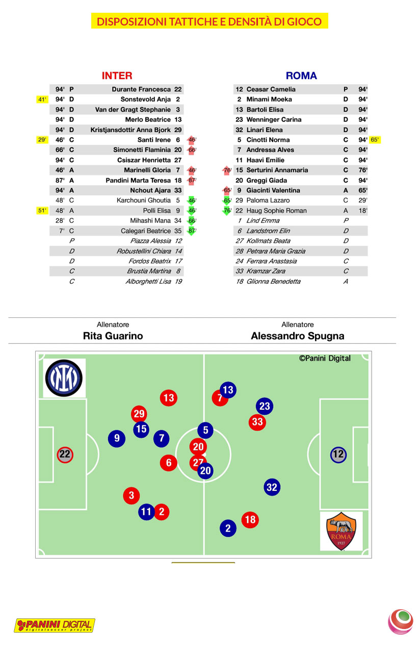 Infine, anche i flussi della costruzione del gioco registrano una sostanziale differenza tra i due schieramenti: l’Inter ha sfruttato molto fraseggio tra difesa e centrocampo per poter arrivare alle punte, mentre la Roma le ha cercate in maniera più veloce e diretta, limitandosi a sfruttare le avanzate di Minami e Bartoli, quest’ultima capace anche di contribuire con 25 palloni recuperati all’interruzione delle manovre avversarie.