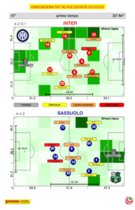 Come confermato anche dal grafico sulla disposizione tattica e sulla densità di gioco, quella andata in scena al Konami Youth Development Centre è stata una partita dominata in lungo e in largo dalle nerazzurre che, nonostante il possesso della sfera non sia stato largamente superiore (53%-47%), hanno schiacciato il Sassuolo nella propria metà campo relegandolo a costruzioni dal basso che non hanno consentito alle emiliane di raggiungere sufficientemente l’area di rigore avversaria: sono, infatti, 30 le palle giocate in zona area dalle neroverdi, la metà esatta rispetto a quelle fatte registrare dalle padrone di casa. Le 17 conclusioni realizzate dalla formazione di Rita Guarino, di cui 10 su azione e 7, tra indirette e dirette, da calcio piazzato, sono arrivate tutte di piede con palla bassa all’infuori di una giunta di testa e 9 di esse hanno trovato lo specchio della porta. Per quanto riguarda le finalizzazioni del Sassuolo, sono 10 quelle complessive, 9 delle quali su azione e 7 da dentro l’area di rigore, la più ghiotta al minuto 63 quando una doppia occasione avrebbe potuto riaprire la partita, anch’essa conclusasi senza successo a causa di chiusure difensive in extremis, la seconda per mano di Durante che ha bloccato il tiro.