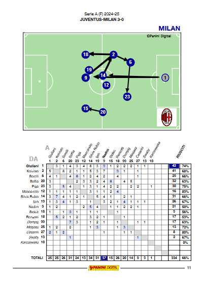 In entrambe le frazioni, l’area di rigore del Milan è stata molto densa e questo perché Giuliani è stata la giocatrice milanista con più passaggi riusciti (42) e la seconda per palle giocate (57), oltre ai numerosi palloni avversari passati da quelle parti per tutto il corso dei 90 minuti. Nella seconda metà è stata molto densa anche la fascia destra che è stata, infatti, protagonista di una delle due tracce più attive delle meneghine: 9 passaggi da Koivisto a Renzotti (come quello da Giuliani a Nadim).