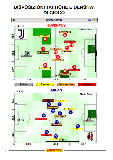 Una delle zone con la maggiore densità è stata la fascia sinistra, quella presieduta da Estelle Cascarino e Pauline Krumbiegel, sostituita, poi, da Lisa Boattin: non a caso la numero 20 è stata la giocatrice juventina con più palle giocate (72), passaggi completati (52) e anche passaggi ricevuti (48), inoltre l’asse da Cascarino a Krumbiegel è stato quello più attivo, con 11 passaggi dal braccetto sinistro all’esterno sinistro. Nella prima frazione è stata molto densa anche la fascia destra, grazie alle numerose scorribande offensive di Lindsey Thomas, e l’area di rigore avversaria, date le 36 palle giocate dalla formazione di casa in quella parte di campo; mentre nella seconda è aumentata la densità nell’area di Pauline Magnin Peyraud a causa dei 27 palloni giocati dalle rossonere in quella zona.