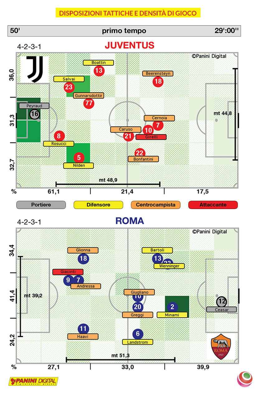 Anche il flusso di gioco delle Campionesse d’Italia in carica evidenzia poca dinamicità: le azioni partite dal portiere Peyraud Magnin viaggiano tra i piedi di Lisa Boattin (per ben 45 volte) per poi girare palla a Rosucci sempre nell’area piccola e chiudere su Salvai. Questa gestione del pallone, oltre ad addormentare il gioco del primo tempo, ha cercato di neutralizzare le avversarie ma nei lanci al centro campo hanno prodotto tutte le ripartenze per Roma che con Glionna ed Andressa Alves.