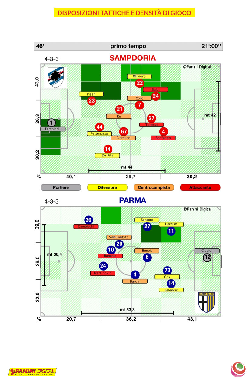 La fase offensiva della Sampdoria ha espresso, su inizio azione, una % di palloni a scavalcare il centrocampo (26.5 contro i soli 7,9%) con tanta ricerca nella profondità usando passi lunghi (ben 27 contro 15) e materializzando nelle iniziative personali la chiave di vittoria finale. Gli 11 dribbling messi a segno, ed una % di attacco delle blu-cerchiate mai viste in questo campionato, hanno dato slancio al gruppo con il 48.2% di attacco alla porta avversaria, contro il solo 41.6% del Parma, e mettendo 15 tiri verso la porta (con sei tra i pali) e 3 reti di pregevole fattura.