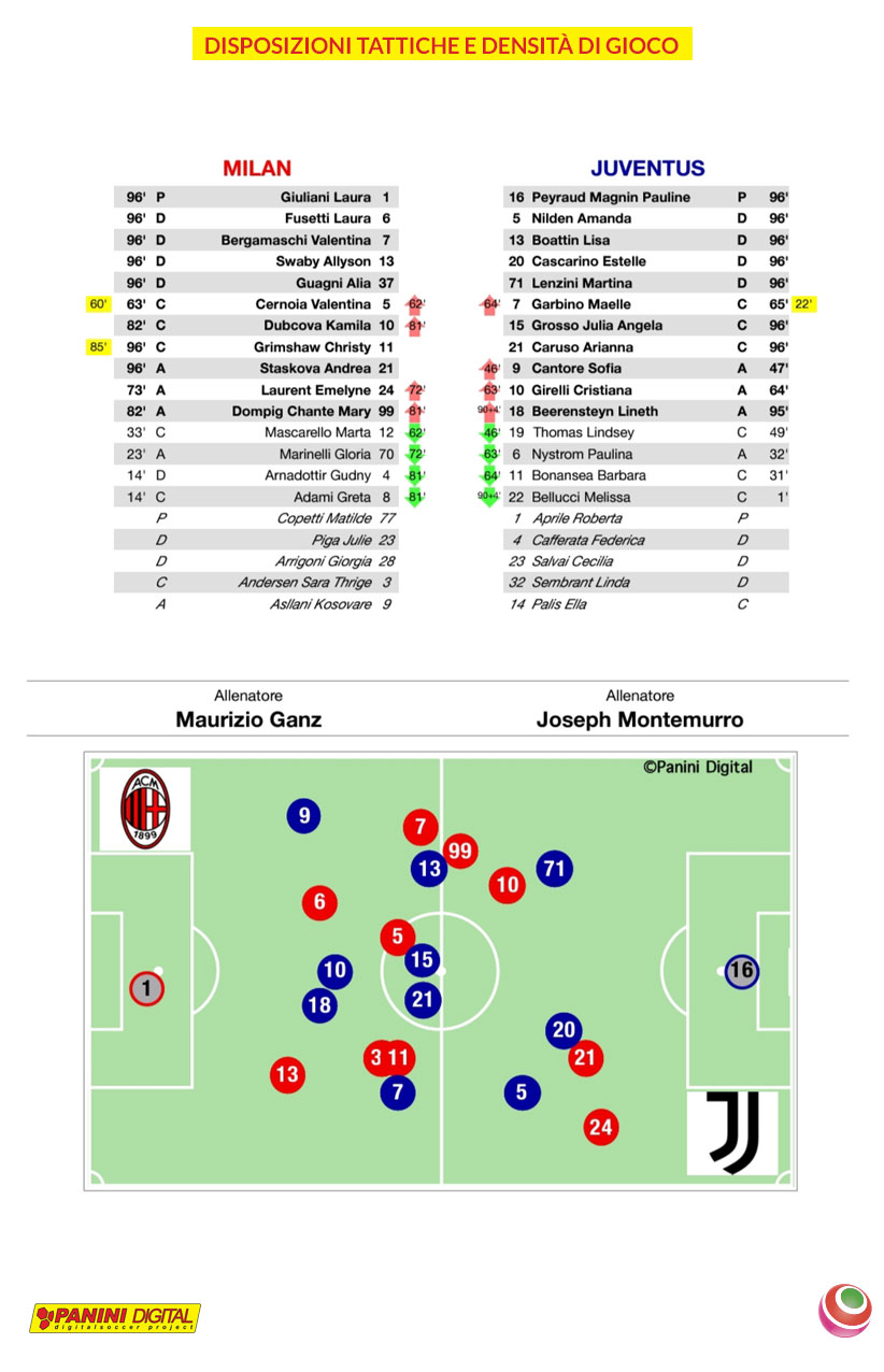 L’analisi della Panini Digital, sulla sfida al Puma Hause of Football del Visamara tra il Milan e la Juventus porta una evidente situazione di calo tecnico-fisico delle padrone di casa. Infatti l’ INDICE di VALUTAZIONE (IVS) della SQUADRA è sceso dal 73 nella gara contro il Napoli, al 35 per la sfida contro la Roma; al 17 per l’ultima gara interna contro le bianco-nere.