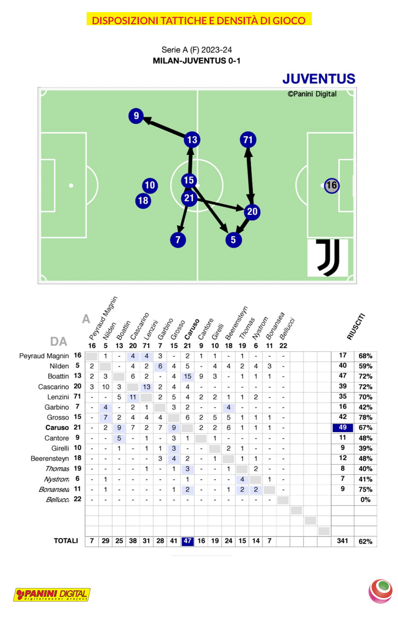 La Juventus con Caruso, oltre a trovare la rete della vittoria, piazza 49 palloni serviti alle compagne (con il 67% dei passaggi riusciti), senza non evidenziare le performance di Grosso (con 42 sfere piazzate) e Cascarino (39). La superiorità e la qualità tecnica del centro campo bianco-nero hanno forse caratterizzato la gara, non ha caso Arianna Caruso è riuscita a manovrare la sfera che ha chiuso il match. In attacco la Juventus vede 3 tiri a rete di Arianna, 2 tiri per Beerensteyn, Boattin e Girelli ed 1 per Bonansea. Anche le attaccanti bianconere, nella serata di Milano, non hanno evidenziato una buona attinenza al loro ruolo.