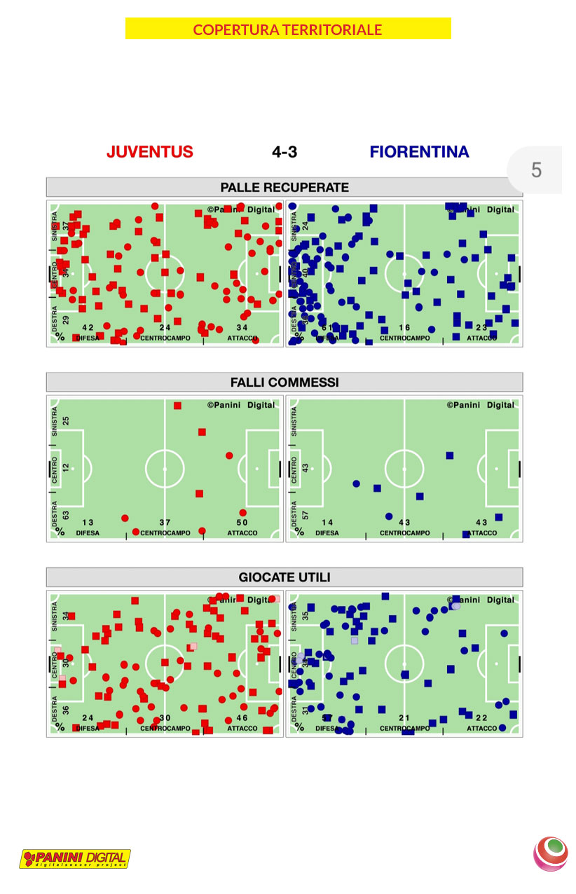 La qualità di gioco vista nella ripresa nelle padrone di casa, oltre che nei passaggi, si è vista nella % dei passaggi riusciti (ben oltre al 72%) e nelle giocate utili che hanno permesso le 4 reti. In generale la Juventus ha dimostrato il giusto carattere che era necessario alla squadra per ricercare la profondità, ad avere più iniziative personali alla ricerca del gol, ed essere pericolose in fase offensiva. Tutte le occasioni portate alla porta viola sono state così premiate, trovando anche un legno pieno di Cristiana Girelli, e la % di efficacia in zona d’attacco alla porta ha dimostrato sul campo (62.5%), la potenzialità del bagaglio tecnico delle ragazze di Joe Montemurro.
