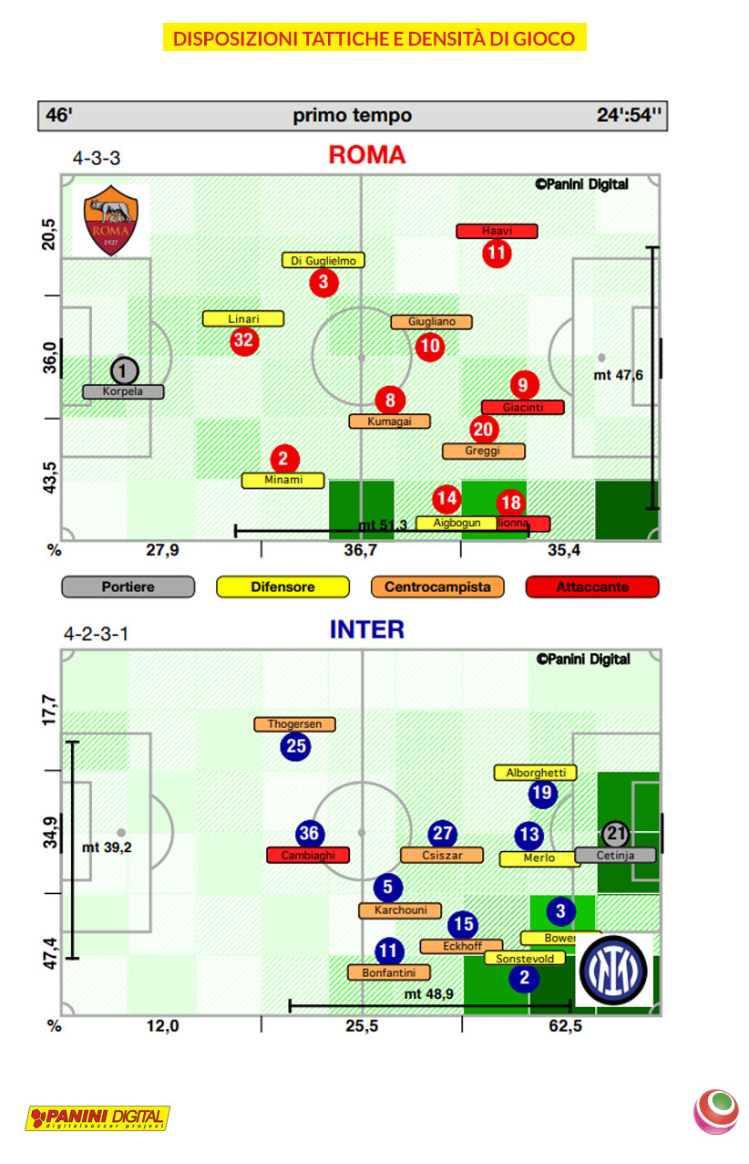 Un 4-3-3 delle padrone di casa, nel primo tempo, ha visto sul fronte opposto il 4-2-3-1 che ha prodotto una copertura territoriale inferiore, ma di grande efficacia, commettendo pochi falli ma utilizzando più ampiezza la Roma ha sfruttato meglio le giocate colpendo a rete ed ipotecando il match.