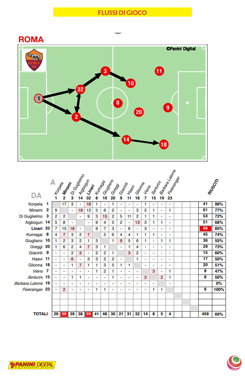 Nel focus sulle giocatrici giallo-rosse si evidenzia non solo Linari, ma anche Aigbogun, con le sue 20 sfere recuperate e 18 giocate utili, per non tralasciare la capitana del giorno: Giugliano, che con i suoi 5 assist si propone, va al tiro sfiorando la rete (tirando in porta più di tutte con 4 tentativi) , ed è sempre partecipe a tutte le iniziative della squadra. Le tre finalizzazioni di Giacinti e Haavi, seguono i 2 di Glionna e Greggi. Anche in questa giornata di big match, il tecnico delle locali porta sul campo Barbara Latorre e Laura Feirersinger, entrambi classe 1993, per 12’: segno che la “rosa” è così ampia e preparata che anche in questo campionato si può permettere ogni tipo di azzardo.