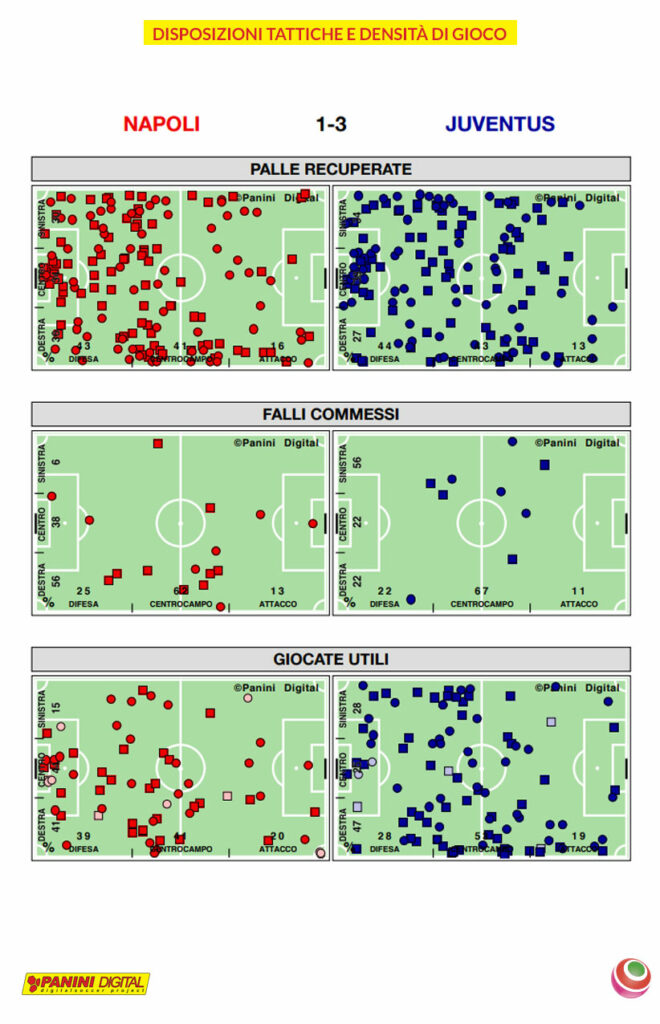Nel dettaglio le palle giocate sono di 634 delle ragazze di Montemurro contro le 386 del Napoli, ma quest’ultime hanno avuto una percentuale di giocate utili migliori del 17,4% a fronte del 15,8. In fase difensiva il pressing azzurro si è fatto sentire specialmente nel primo tempo con il 46,4 % e un maggior numero di palle giocate in area avversaria (ben 34 contro le 28 bianconere).