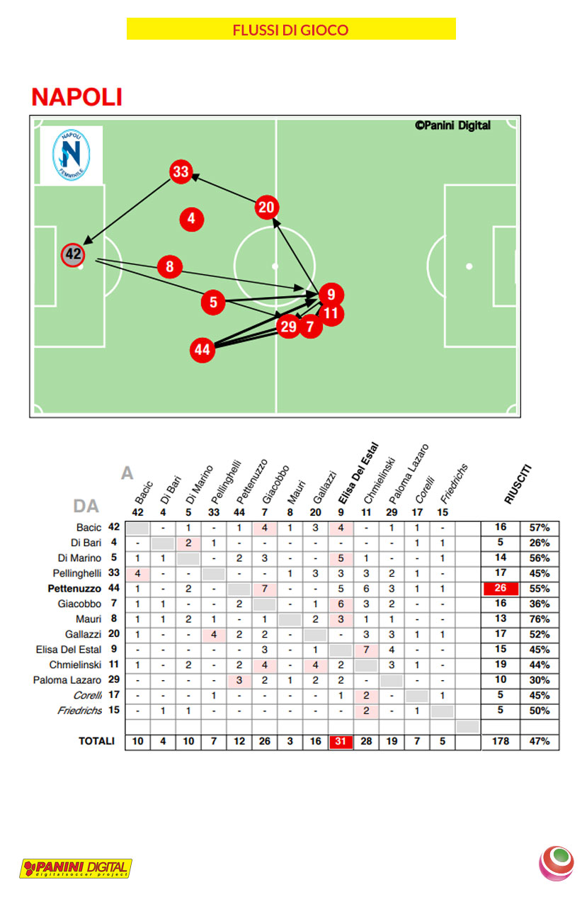 Nei flussi di gioco la migliore in campo è sempre Pettenuzzo con 26 passaggi riusciti verso Del Estal, per la Juve le migliori Boattin e Lenzini con 69 passaggi riusciti per entrambe.