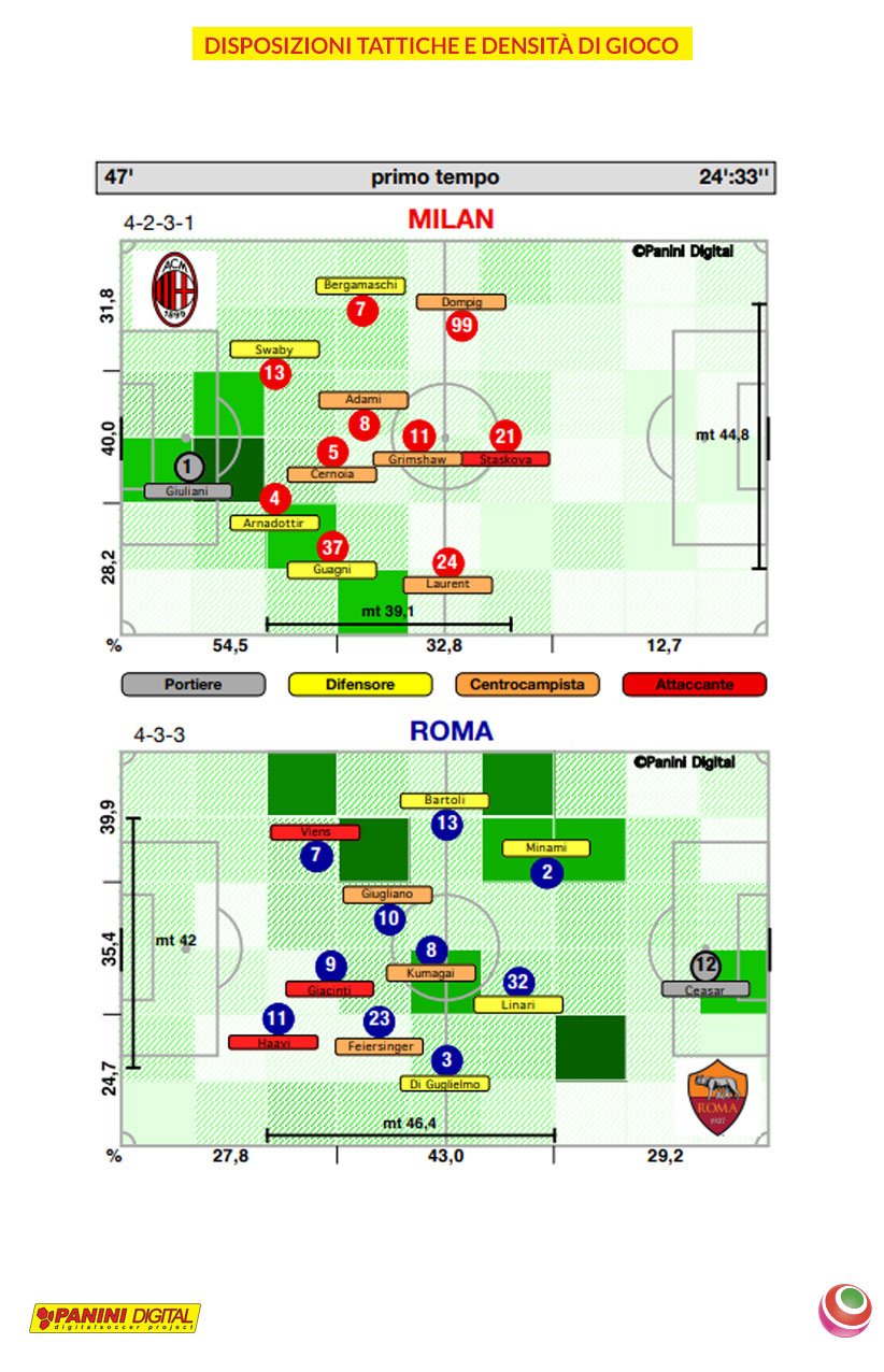 Dai dati Generali si vede che la Roma di Alessandro Spugna ha generato un volume di gioco superiore al primo tempo con 26 minuti di possesso palla (contro i 20 delle padrone di casa) e con 373 passaggi di cui 58 utili: andando a segno due volte. Il Milan di Maurizio Ganz, cambiando modulo in fase offensiva porta il baricentro dai 41,7 metri dei primi quaranta cinque minuti al 59,3 dell’inizio ripresa: dove riesce a riprendere la partita ed a trovare il 2 a 2 parziale.