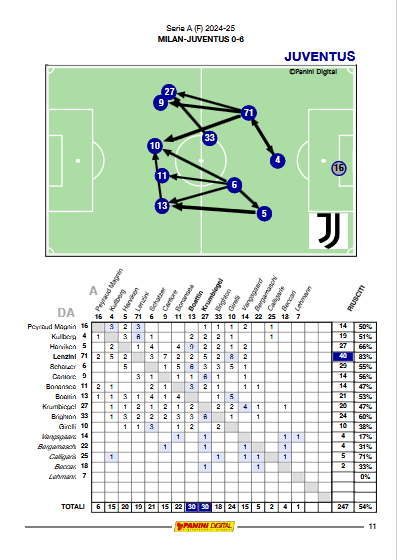Anche nella seconda frazione il modulo di partenza è stato un 3-4-2-1, con ancora le posizioni degli esterni e dei trequartisti allineate a quelle della punta, mentre il baricentro è stato più basso in modo da difendere l’enorme vantaggio di 4 gol e sfruttare gli spazi aperti lasciati dal Diavolo per affondare e trovare anche la quinta e la sesta rete. L’area di rigore di Magnin Peyraud è stata la zona più densa a causa dell’aumento del numero di palloni giocati in area dalle avversarie nel corso della seconda metà anche se non hanno mai realmente spaventato la retroguardia juventina.