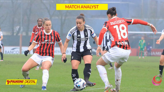 Il Diavolo è sceso in campo con un 4-3-3 ordinato in cui i due terzini, Emma Koivisto e Valery Vigilucci, hanno mantenuto una posizione più bassa e conservativa rispetto al solito e la mezzala di sinistra, Giorgia Arrigoni, e il mediano, Marta Mascarello, alternavano spesso la propria posizione per tentare di non dare punti di riferimento al centrocampo bianconero, cosa che in realtà non ha ottenuto risultati. Le due zone più dense della prima metà sono state quella di Julie Piga e quella di Monica Renzotti. La centrale di difesa italiana classe 1998 è stata la prima per giocate utili (17) e per palle recuperate (32) e seconda per palle giocate (70); mentre l’ala italiana classe 2005 è stata la più attiva sul fronte meneghino con i suoi tentativi, futili, di scardinare il lucchetto della difesa della formazione di Torino.