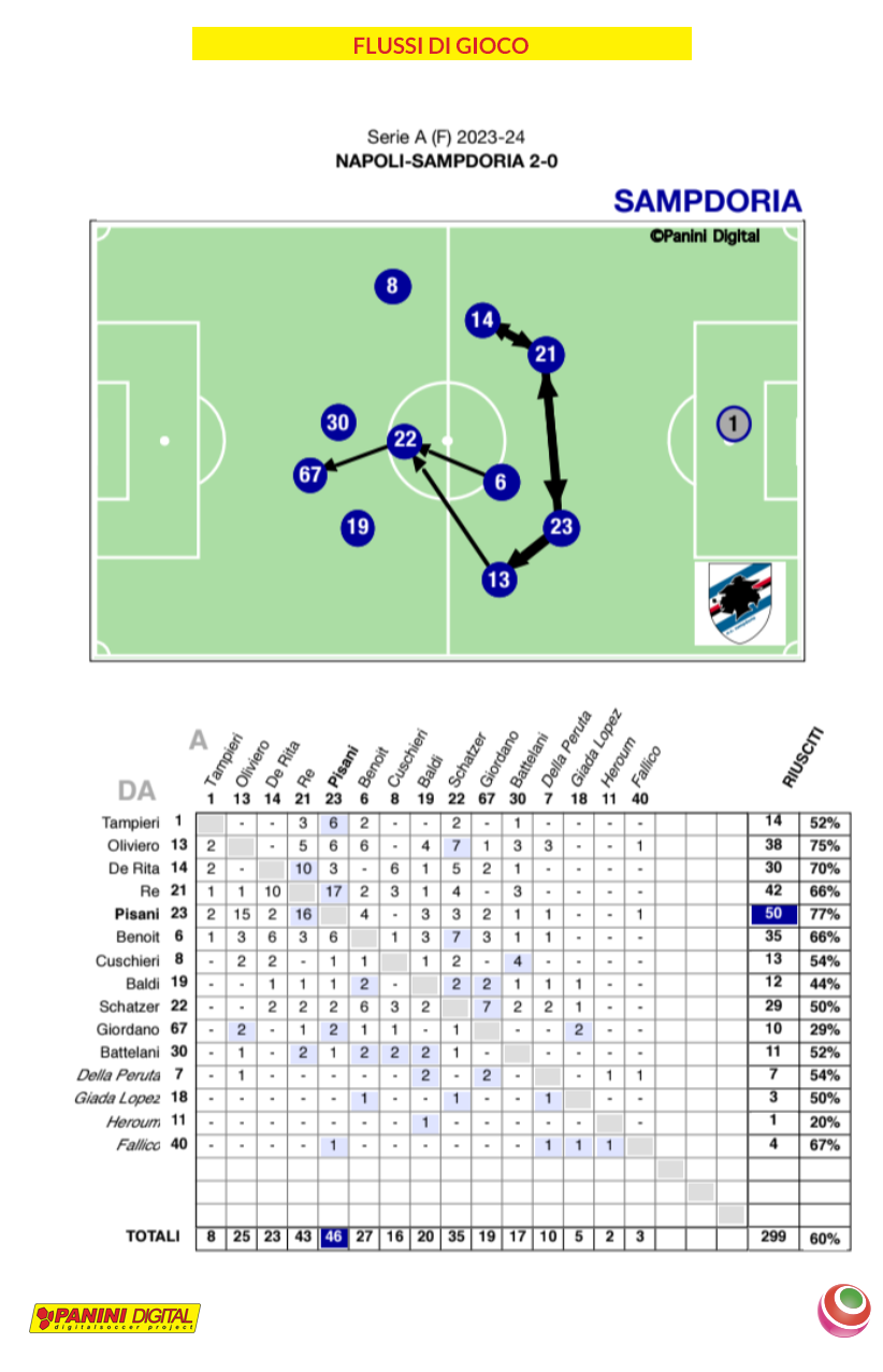 Sono due i numeri che intendiamo estrapolare dai dati Panini Digital per quanto concerne i flussi di gioco. La migliore risulta Elena Pisani, che effettua 50 passaggi riusciti per una percentuale del 77%, e ne riceve 46. Interessante il dialogo con la compagna di reparto Cecilia Re, che le gioca 17 palloni e ne riceve da lei 16. Anche i numeri di Re sono buoni: 42 passaggi riusciti (ma come percentuale inferiore ad Oliviero e De Rita) e 43 ricevuti.