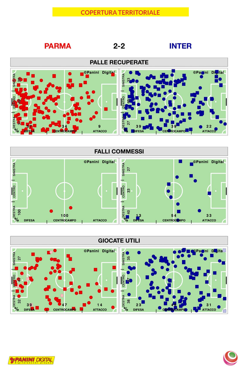 Secondo i dati elaborati da Panini Digital l’Inter è stata più pericolosa del Parma, per questo ha ottenuto 63 punti su 100 nell’Indice di Valutazione Squadra: è stata superiore nel possesso palla, in particolare nella metà campo avversaria facendo registrare il 69% di supremazia territoriale (equivalente a quasi 15 minuti) contro i soli 6 minuti e mezzo delle emiliane, nelle 678 palle giocate a fronte delle 487 di marca gialloblù e nella pericolosità sotto porta. E’ soprattutto nei numeri statistici in attacco che si nota l’evoluzione offensiva delle ragazze di Rita Guarino avvenuta in corso d’opera, brave a valorizzare il passaggio dal 4-3-3 al più incisivo 4-2-3-1: nei secondi 45 minuti, infatti, si aggiungono 15 tiri ai 7 della prima frazione, portando il complessivo delle finalizzazioni a 22, di cui solo 9 hanno centrato lo specchio della porta perché 10 sono state ribattute o deviate e 3 sono finite al lato della porta difesa da Capelletti. Le conclusioni totali realizzate dallo schieramento di Mister Panico verso i pali nerazzurri sono 12, metà arrivate su azione e metà indirettamente da calcio da fermo, metà da dentro l’area di rigore e metà da fuori, nessuna di testa. Le emiliane nella ripresa hanno ceduto il dominio del campo irrobustendo la manovra avversaria anche lungo le corsie esterne del terreno di gioco, ma tra i fattori che hanno portato al ribasso i dati relativi alle palle giocate in zona area concorre anche il numero di falli: l’Inter ne ha commessi ben 15, fermando sul nascere le possibili occasioni offensive delle gialloblù che, di contro, sono state meno “cattive” e più “permissive” commettendone solo 2.