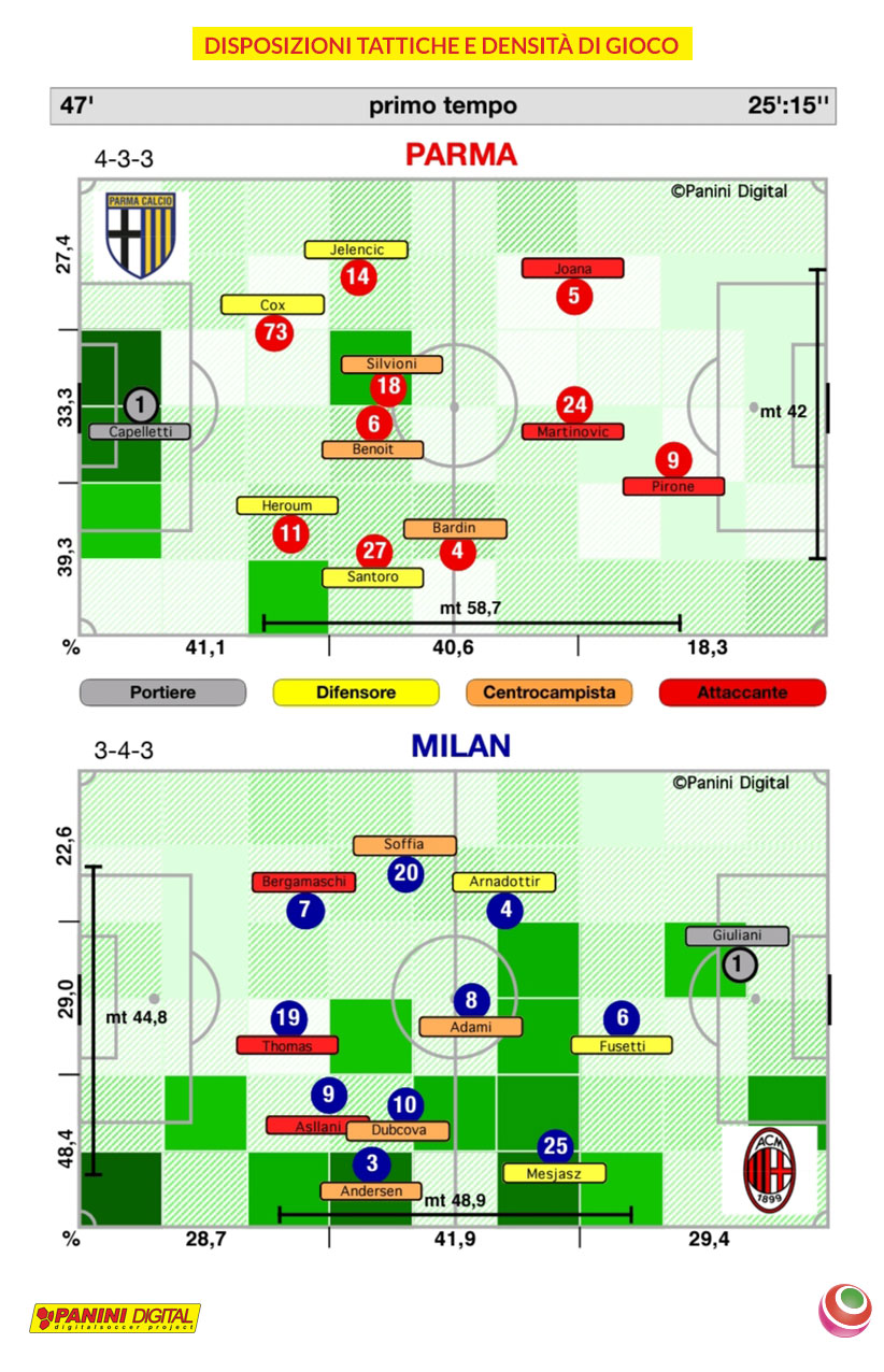 Non c’è storia al Tardini: il match tra Parma e Milan termina con una vittoria travolgente delle rossonere per 4 reti a zero. Una partita quasi a senso unico, confermato anche dall’Indice di Valutazione Squadra attestatosi sul punteggio di 26 a 74, che ha visto le padrone di casa creare una bassissima percentuale di pericolosità, giocando solamente 20 palloni nei pressi dell’area di rigore avversaria e calciando 8 volte con esito ininfluente verso la porta del Milan.