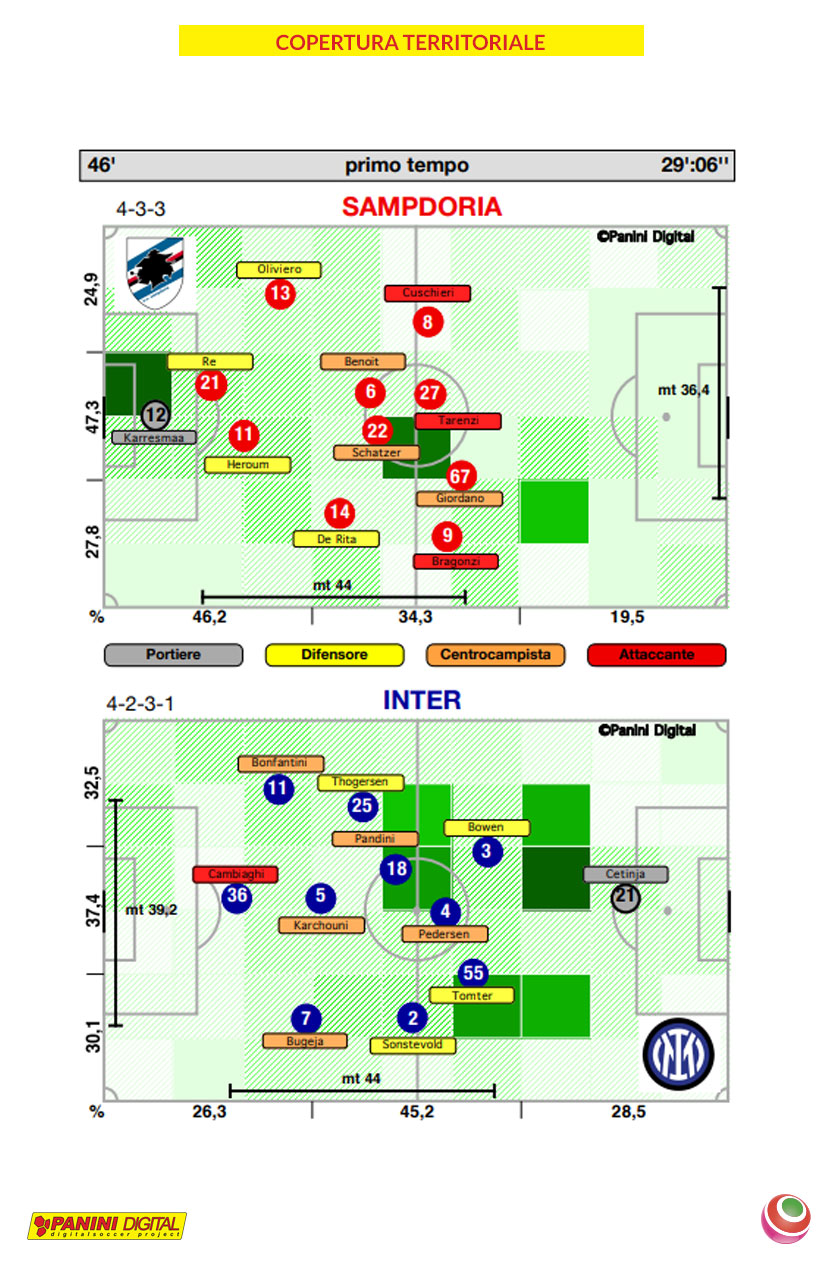 La fase offensiva, sviluppa inoltre, dati di tutto rilievo con il 93.9% di azioni manovrate da dietro, per la ricerca della profondità (con passaggi bassi e utili nella metà campo avversaria) che hanno calibrato 248 tocchi di alta professionalità. L’utilizzo dell’ampiezza di campo, per il 70% con cross su azione da destra ( ed il restate sul lato opposto) contraddistinguono la pericolosità dell’attacco.