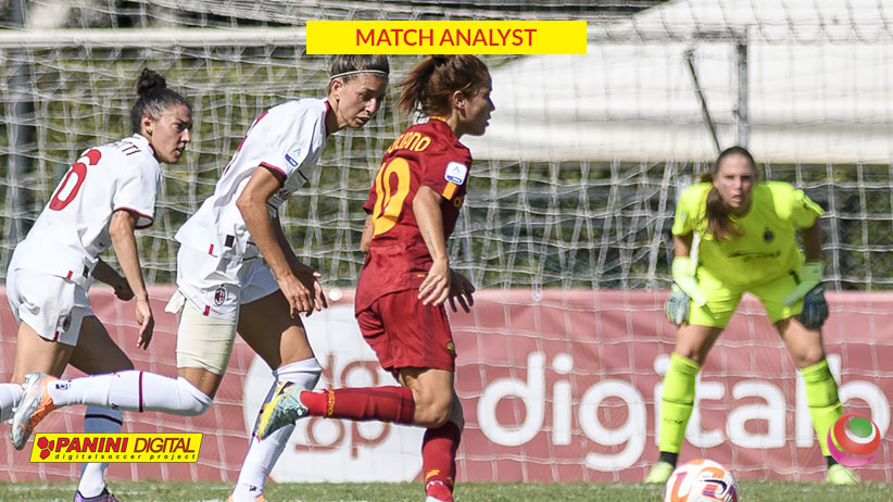 Per la Roma, sebbene le statistiche firmate Panini Digital Soccer riportino dati soddisfacenti, il risultato potrebbe non esserlo, perché quella supremazia in campo non ha prodotto un divario così ampio in termini di risultato finale e di reti messe a segno, dovuto anche alla buona tenuta difensiva delle rossonere che hanno registrato buone percentuali sui parametri relativi alla difesa della porta, forte anche di una super Laura Giuliani, provvidenziale in un duplice intervento al 30′ minuto e nella paratona del 40′ sul tiro da fuori area di Serturini. Un errore in fase di impostazione 3 minuti dopo ha costretto il Milan a rientrare negli spogliatoi sotto di due reti a zero. Altri due super interventi di Giuliani hanno tenuto invariato il punteggio nel secondo tempo, tramite una grande respinta al 60′ e una coraggiosa uscita bassa 20 minuti più tardi.