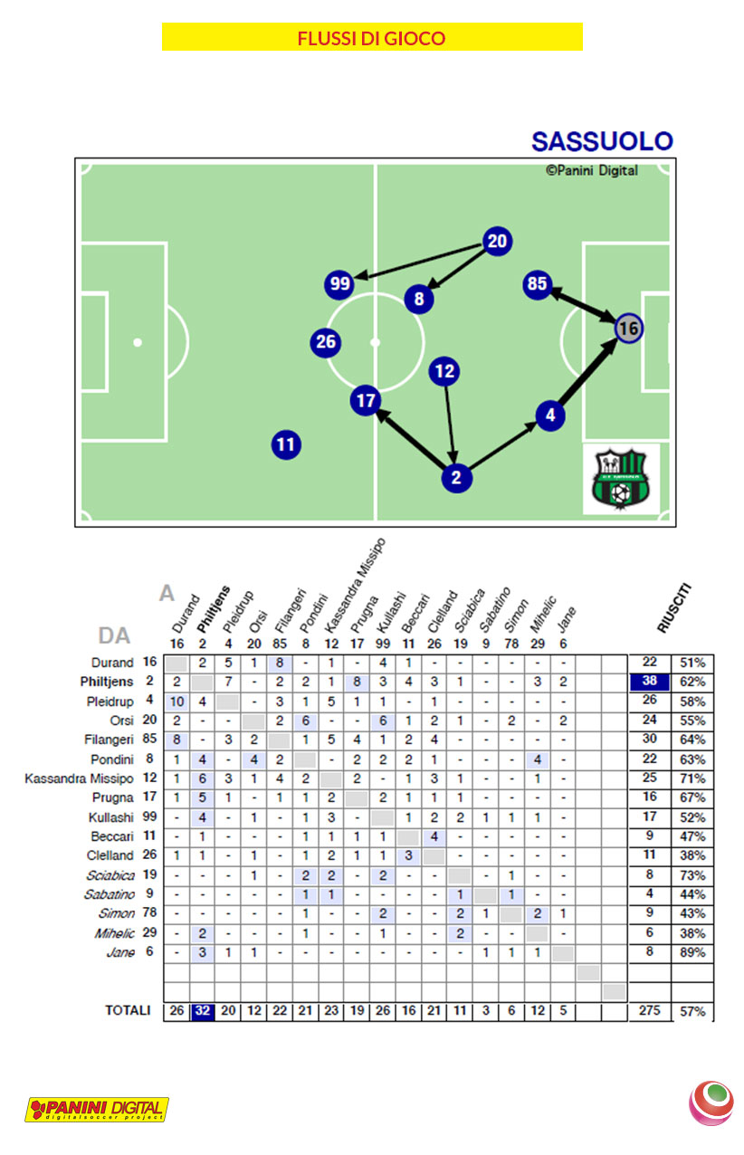 Vediamo il flusso di gioco di Roma e Sassuolo. Partiamo dalla Lupa che hanno giocato 626 volte il pallone (56%), mentre ha effettuato 403 passaggi riusciti (59%): a fare più passaggi è stata Elena Linari che ha servito 76 palloni (88%), e 17 li ha consegnati a Camelia Ceasar, ma allo stesso tempo l’ex difensore di Brescia e Fiorentina e si è vista consegnare ben 50 sfere nell’arco di tutto l’incontro.