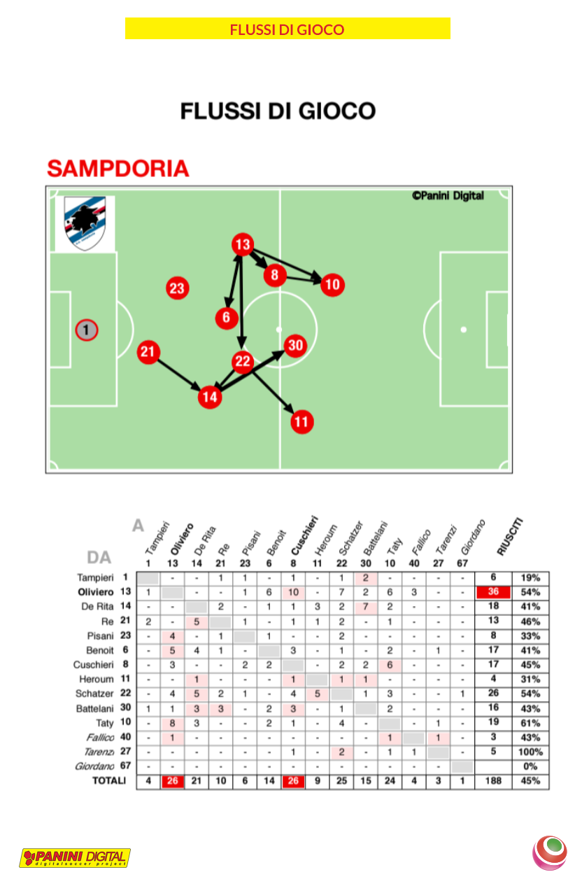 La stessa Pisani ha numeri simili a Cecilia Re, per un reparto difensivo attivo sia in difesa, sia in zona gol. Infatti le occasioni più importanti le crea proprio la difesa delle Doriane. Per Aurora De Rita, che impegna Bačić al 64′, numeri inferiori ad Oliviero, ma ha un dato minore di palle perse, 17, contro le 22 della compagna di reparto. Per quanto riguarda le statistiche delle altre due giocatrici più attive, a Cuschieri riescono 4 dribbling utili su 5 tentati, e 10 palle recuperate effettive su 12 (83%). Per Tatiely Sena invece, 8 dribbling riusciti su 8 tentati, e 15 giocate utili, una in più di Oliviero. E soprattutto, è la giocatrice che subisce più falli (4).
