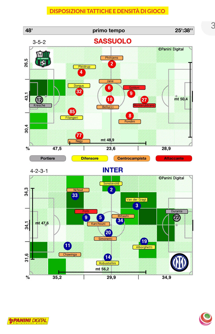 Come evidenziato anche dall’Indice di Valutazione Squadra delle statistiche Panini Digital Soccer, ai punti e a larghi tratti la formazione nerazzurra è stata superiore, soprattutto nella parte finale del match dove la differenza di condizione atletica si è fatta notare: è risultata, però, poco pungente al momento di concludere a rete, calciando ben 23 volte nell’arco della partita, di cui solo 5 in porta, e allo stesso tempo molto sfortunata colpendo 3 volte la traversa. Le statistiche relative alle finalizzazioni del Sassuolo indicano 9 tiri verso i pali protetti da Durante, 8 dei quali di piede con palla bassa ed uno solo, ma vincente e andato a segno, di testa.