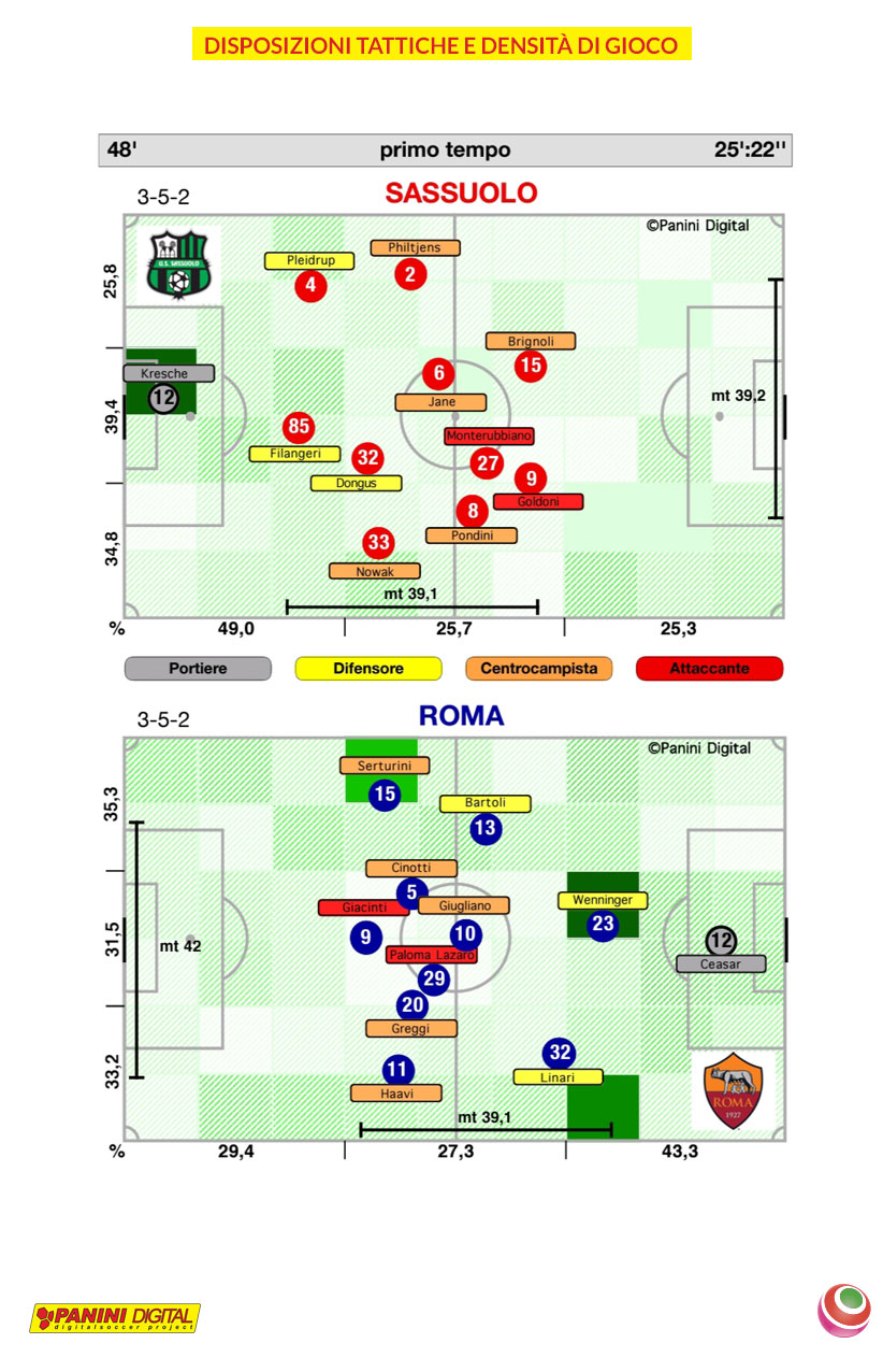 Come dimostrato dai flussi di gioco, il Sassuolo ha cercato di costruire azioni per vie centrali, sfruttando le qualità tecniche e tattiche di Jane che, utile in interdizione con 17 palloni recuperati e chiamata in causa 39 volte, ha realizzato correttamente 42 passaggi che corrispondono al 70% delle sue giocate totali, tirando anche una volta verso la porta. Di contro, la Roma ha cercato maggior ampiezza nel gioco, fino a sfruttare le due corsie laterali per trovare maggior verticalità a sinistra. La prestazione maiuscola di Bartoli con 97 palle giocate e 20 giocate utili (al pari di Linari), viene premiata con la rete decisiva.
