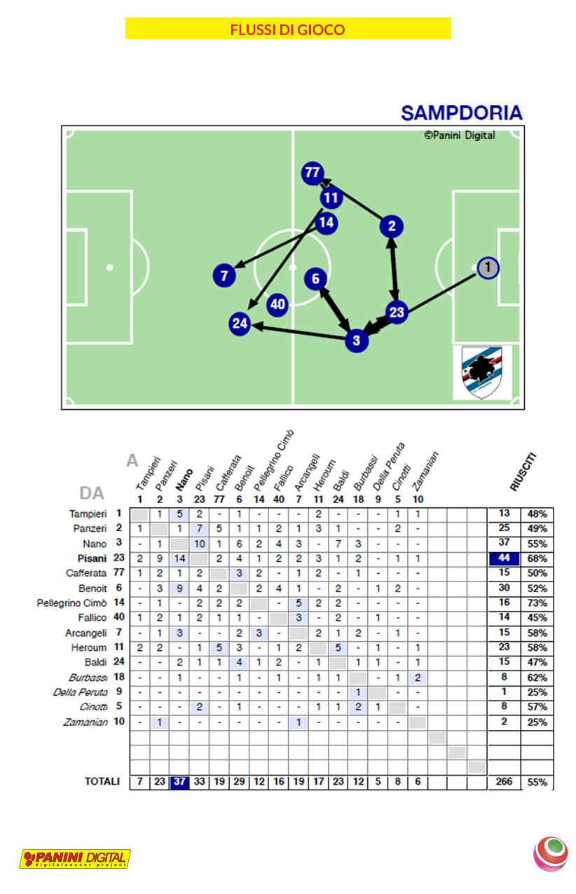 Per quanto riguarda la squadra doriana, essa ha usato la sfera 496 volte (46%), e se l’è passata 266 volte (44%). È Elena Pisani quella che ne ha fatto di più: infatti, ha passato 44 volte la sfera. Maria Vittoria Nano ma l’ha ricevuta 27 volte.